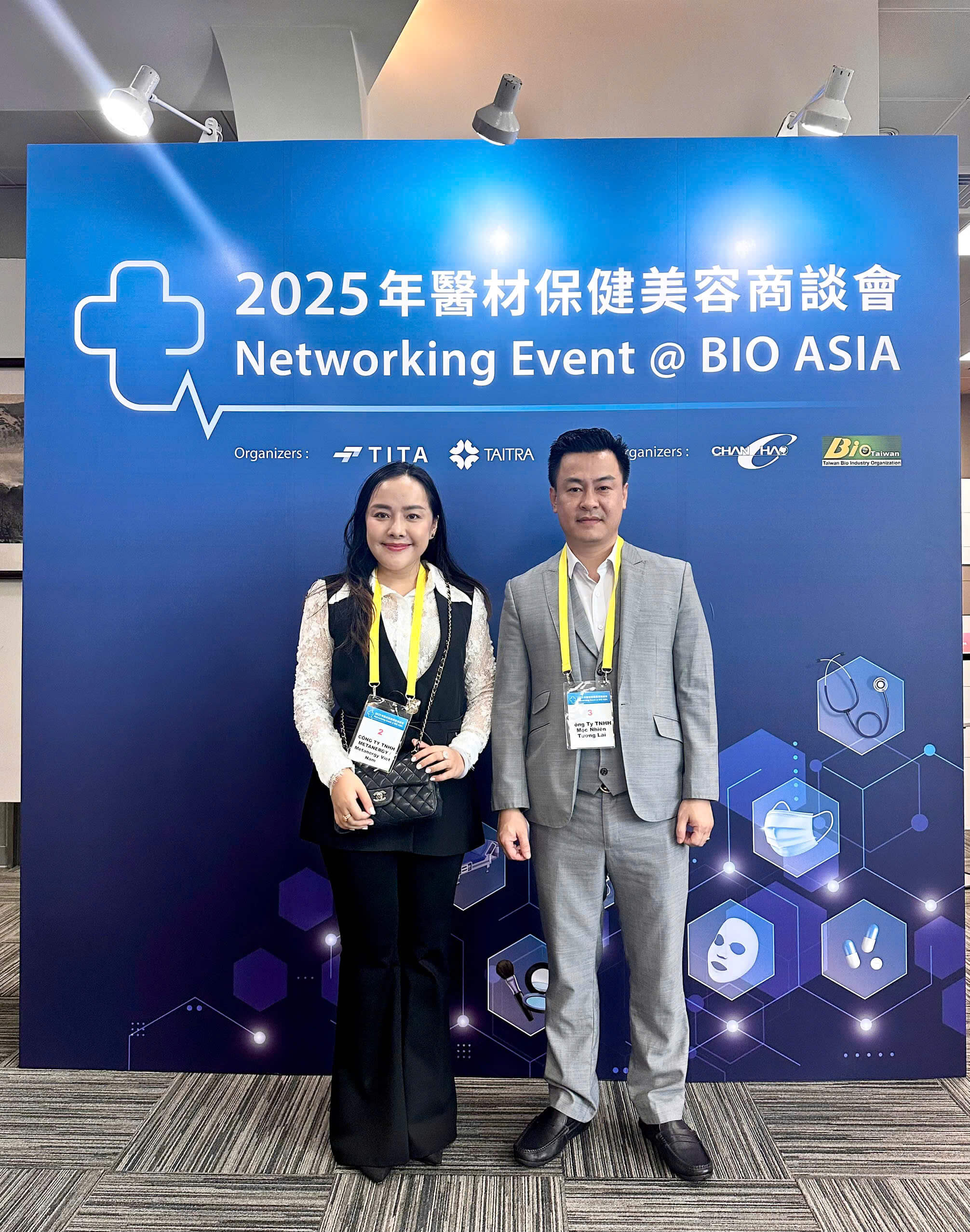 - Sự kiện diễn ra từ ngày 25/7-27/7 tại Đài Bắc, Đài Loan đã có sự góp mặt của Công ty Metanergy - đại diện cho phía doanh nghiệp Việt Nam. Chị Bùi Thị Hồng Nhung - Giám đốc điều hành và anh Thẩm Hữu Hiền - Giám đốc đào tạo đã tham dự diễn đàn xu hướng làn sóng công nghệ sinh học, AI, tái tạo tế bào, gen... trong lĩnh vực y tế, sức khoẻ, thẩm mỹ y học... Công Ty Metanergy đã chọn lọc và kết nối với các đối tác là nhà sản xuất, trường đại học, bệnh viện và các doanh nghiệp top tại Đài Loan đang quan tâm đến thị trường Việt Nam và phát triển tại thị trường Việt Nam. Anh Hiền và chị Nhung cũng đã có chuyến viếng thăm đến các nhà máy và trung tâm đào tạo tiềm năng. Chuyến giao thương đã mở ra cơ hội hợp tác, phát triển, “vì một Đài Loan và Việt Nam khoẻ mạnh, đổi mới, phát triển toàn diện trong kỷ nguyên số”.